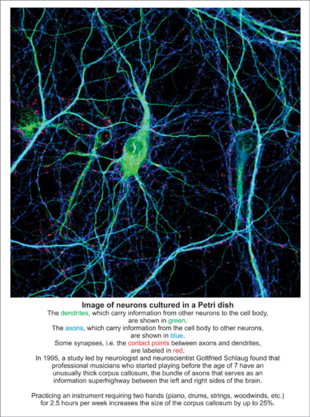 New Research Links Music Study and Increased Brain Size New research findings that show playing a musical instrument increases the size of the sound-processing area of the brain were published in the April 23 issue of Nature magazine. Neuroscientist Christo Pantev and colleagues at the University of Muenster in Germany used magnetic source imaging to compare the brains of skilled musicians and people who have never played a musical note. They discovered that the musicians' auditory cortex, which responds to pitching a sound on a piano, was about 25 percent larger than their non-musical counterparts. The researchers also found that the younger the musicians began their training, the more the cortex developed. Pantev told the Reuters News Service in April that the brain processes acoustic stimuli, such as musical notes on a piano, as so-called tonotopic maps. Neurones--cells that transmit nerve impulses-- are grouped together on the maps in the brain according to pitch. But because musical tones are different from ordinary sounds, more neurons are needed to process the more complicated notes. A musician's training develops the area of the brain in a different way. More neurones are involved and are working more harmoniously, which Pantev said could explain how young musicians develop such extraordinary talent. The more experienced musicians had larger tonotopic maps. The study supports earlier research that showed a difference in the part of the brain controlling the left and right hand fingers of string musicians. "We found that the representation of the fingers of the left hand are bigger than the representation of the fingers of the right hand," Pantev told Reuters. Music makes us smarter According to research conducted at the University of California at Irvine. The positive effect of music has been understood for a long time. Plato once said that music "is a more potent instrument than any other for education." Now scientists know why. According to Newsweek magazine, music trains the brain for higher forms of thinking. Researchers at the UCI studied three year olds and found that after taking piano lessons and choir for 8 months, they became expert puzzle makers, scoring 80% higher than their playmates did in spatial intelligence. "Early music training can enhance a child's ability to reason'" says Irvine physicist Gordon Shaw. According to researchers these skills later translate into complex math and engineering skills. Shaw believes that as children listen to classical music they exercise their cortical neurons, which also strengthens circuits used for higher- order thinking skills. Einstein, who was a violinist, speaking about his theory of relativity said, "it occurred to me by intuition, and music was the driving force behind that intuition. The discovery was the result of musical perception." For more information check out the UCI web site : http://www.musica.uci.edu Your Brain on Music Ongoing research shows that classical music is good for the brain: The cerebellum is larger in classically trained musicians than in people who don't play a musical instrument, Dr. Gottfried Schlaug of Beth Israel Deaconess Medical Center in Boston reported at the Society of Neuroscience convention in 1998. The cerebellum is a region of the brain responsible for posture, balance, coordination and fine motor movements. Research pursued at the University of California , Irvine , led by psychologist Frances Rauscher, Ph.D, and neuroscientist Gordon Shaw, Ph.D., shows that there is "an unmistakable causal link between music and spatial intelligence, reversing the once commonly held view that music education is irrelevant to intellectual development." In this study in the mid-1990s, researchers concluded that spatial- reasoning abilities are crucial for such higher brain function such as music, complex mathematics and chess. Results showed that the spatial-reasoning performance of 18 preschool children who took eight months of music lessons far exceeded the spatial reasoning of a demographically comparable group of 15 preschool children who went without music lessons. A similar study in the late '90s by Shaw and Rauscher showed that children who received piano training performed 34 percent higher on tests measuring spatial temporal ability than children instructed in computers. "It has been clearly documented that young students have difficulty understanding the concepts of proportion (used in math and science) and that no successful program has been developed to teach these concepts in the school system. The high proportion of children who saw dramatic improvements in spatial-temporal reasoning as a result of musical training should be of great interest to scientists and educators," the research team noted. Students who study music scored higher on both the verbal and math portions of the SAT than did non-music students, according to the College Entrance Examination Boards, as reported in Symphony, 1996.
